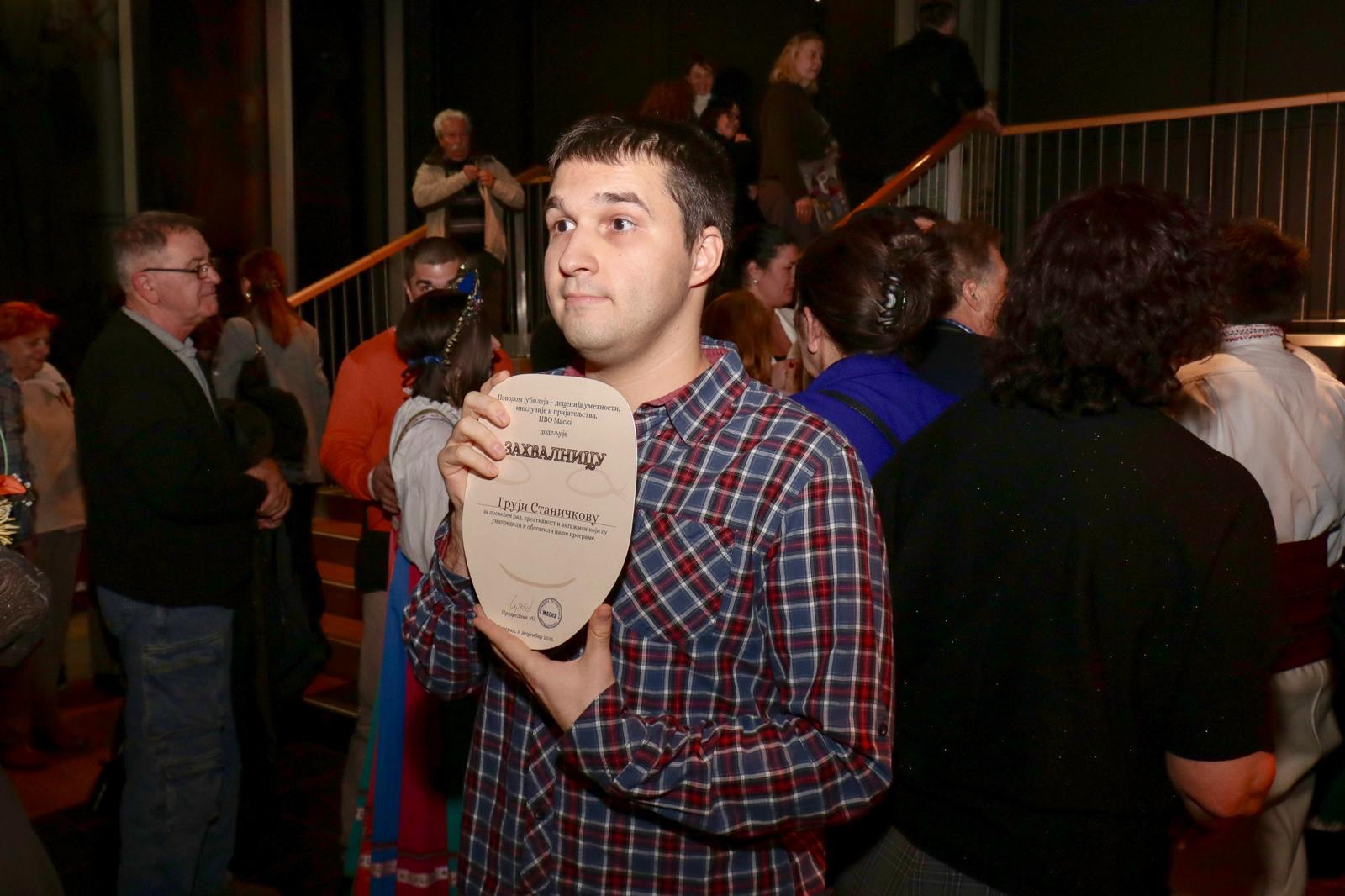 „Поносни смо што је Министарство, кроз различите програме подржавало рад НВО Маска током читаве претходне деценије. Ваша истрајност, професионализам и посвећеност учинили су да та подршка увек буде оправдана и усмерена ка истинском развоју“, нагласила је Барошевић, којој је уручена захвалница за допринос развоју инклузивног стваралаштва.