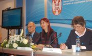 Учесници трибине: Жељко Симић, начелник Одељења матичне евиденције у Сектору за остваривање права из ПИО у Дирекцији РФ ПИО, и Славица Мариновић, виши саветник у Министарству привреде Републике Србије.
